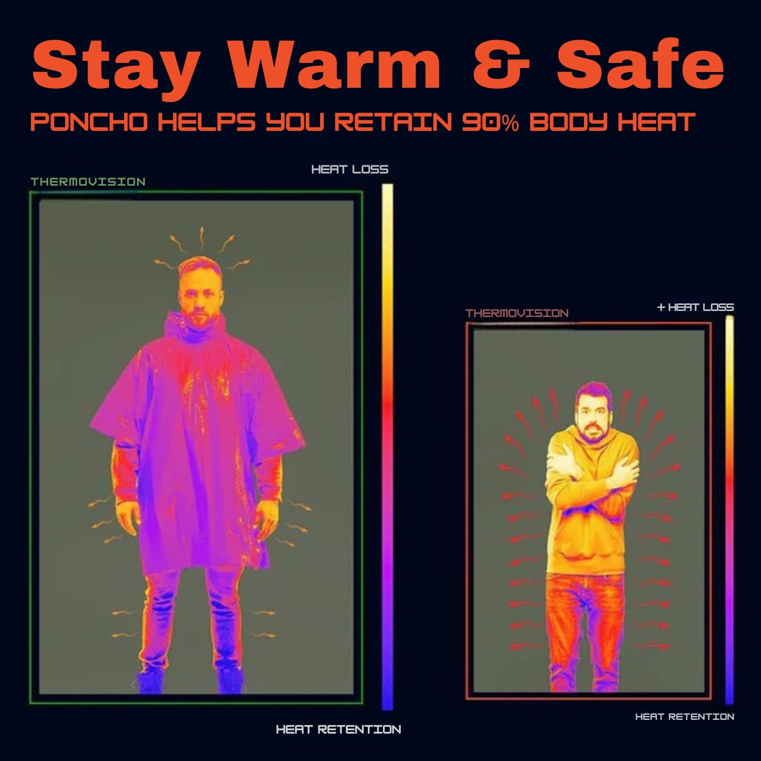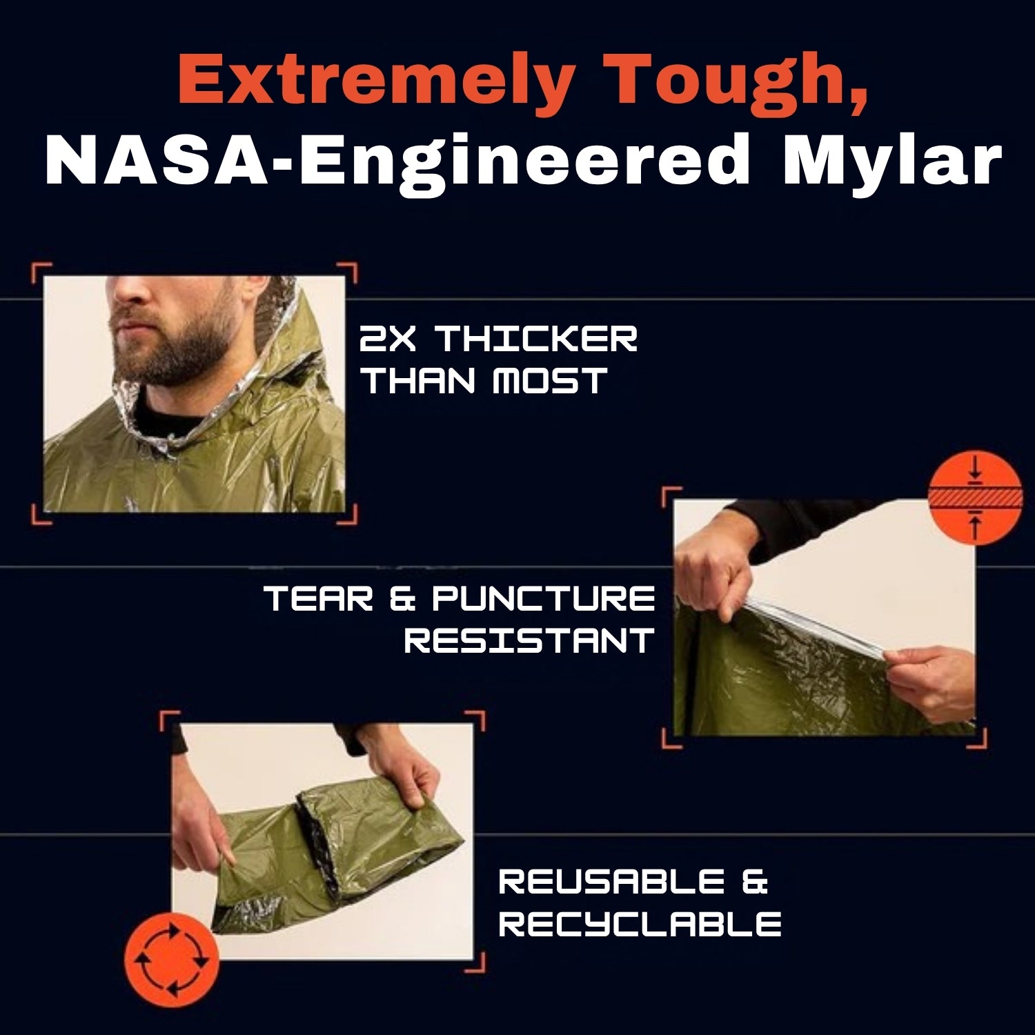 We use high-grade, tear-resistant material with a waterproof outer shell and heat-reflective inner lining to keep you dry and warm.